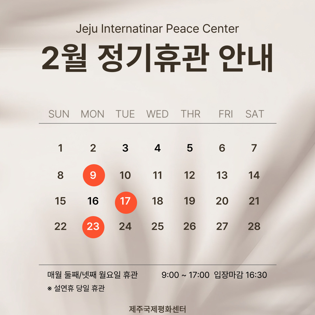 이 곳 제주국제평화센터에서 미래로 도약하는 세계평화중심지의 위상을 다함께 경험해보시길 바랍니다.